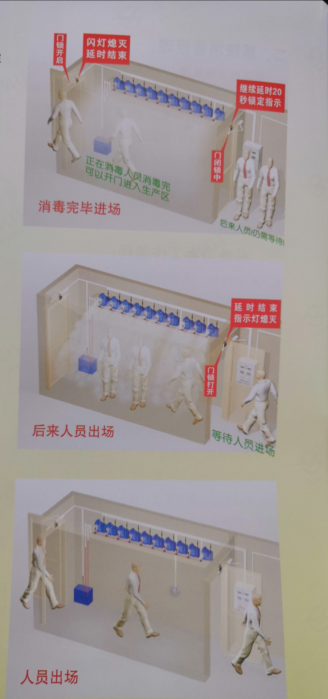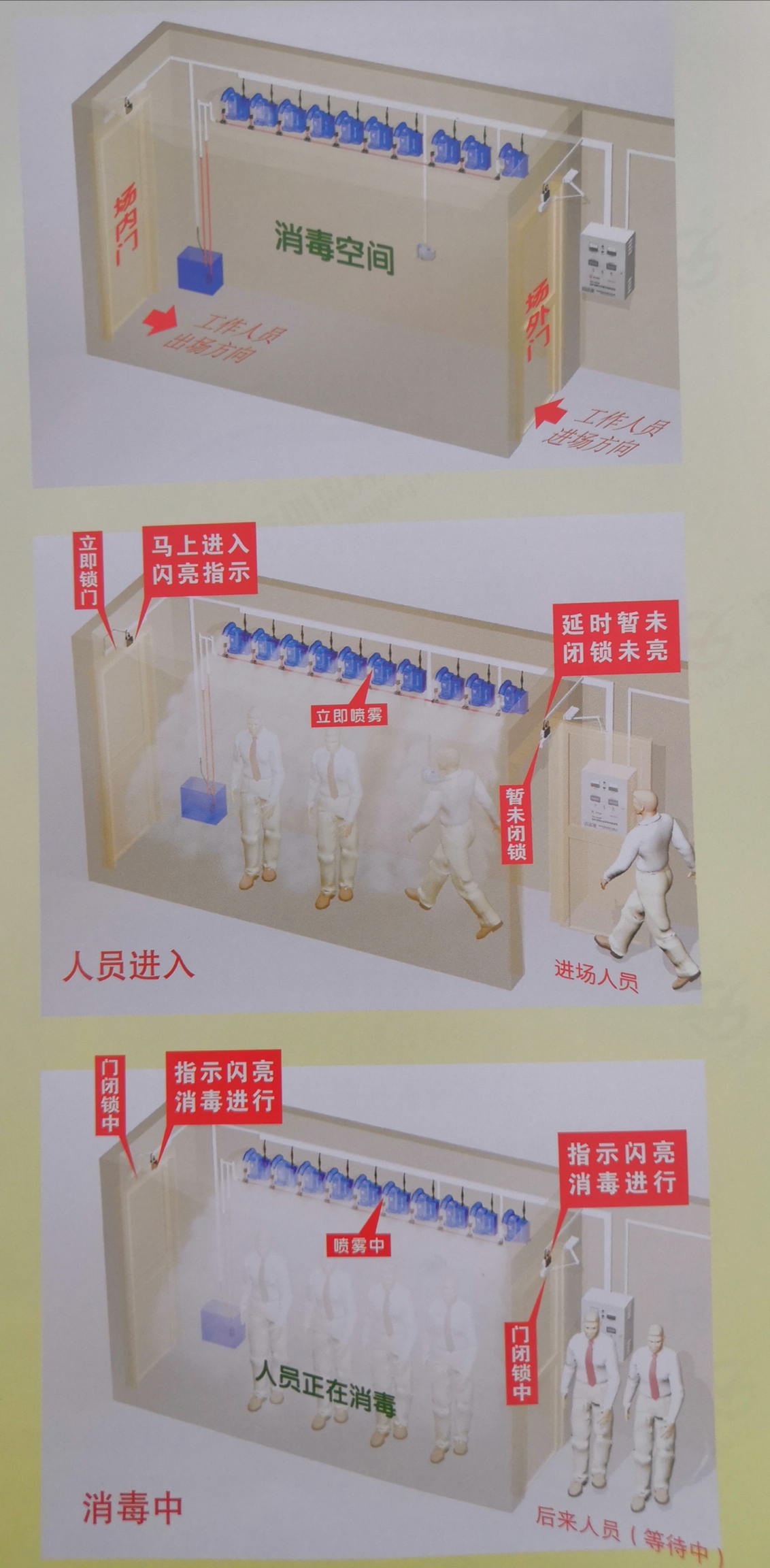 1、強制消毒:當(dāng)人員進入通道,自控體系會使消毒室的門自動上鎖,進行強制消毒,消毒完畢后自動打開,消毒徹底,杜絕情面關(guān)系。